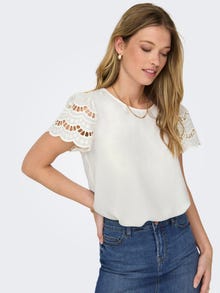 Forvandle hverdagsantrekket ditt på sekunder ved å legge til en feminin topp for en myk og ren look. Bomull er laget av naturfibre, noe som gir et mykt og pustende stoff. JDY er et komplett, internasjonalt motemerke som tilbyr rimelige og trendy produkter til motebevisste forbrukere. - Produkttype : Topp - Hals : O-hals - Erme : Korte ermer - Ermer : Volumermer - Detaljer : Blondedetalj - Passform : Regular Fit