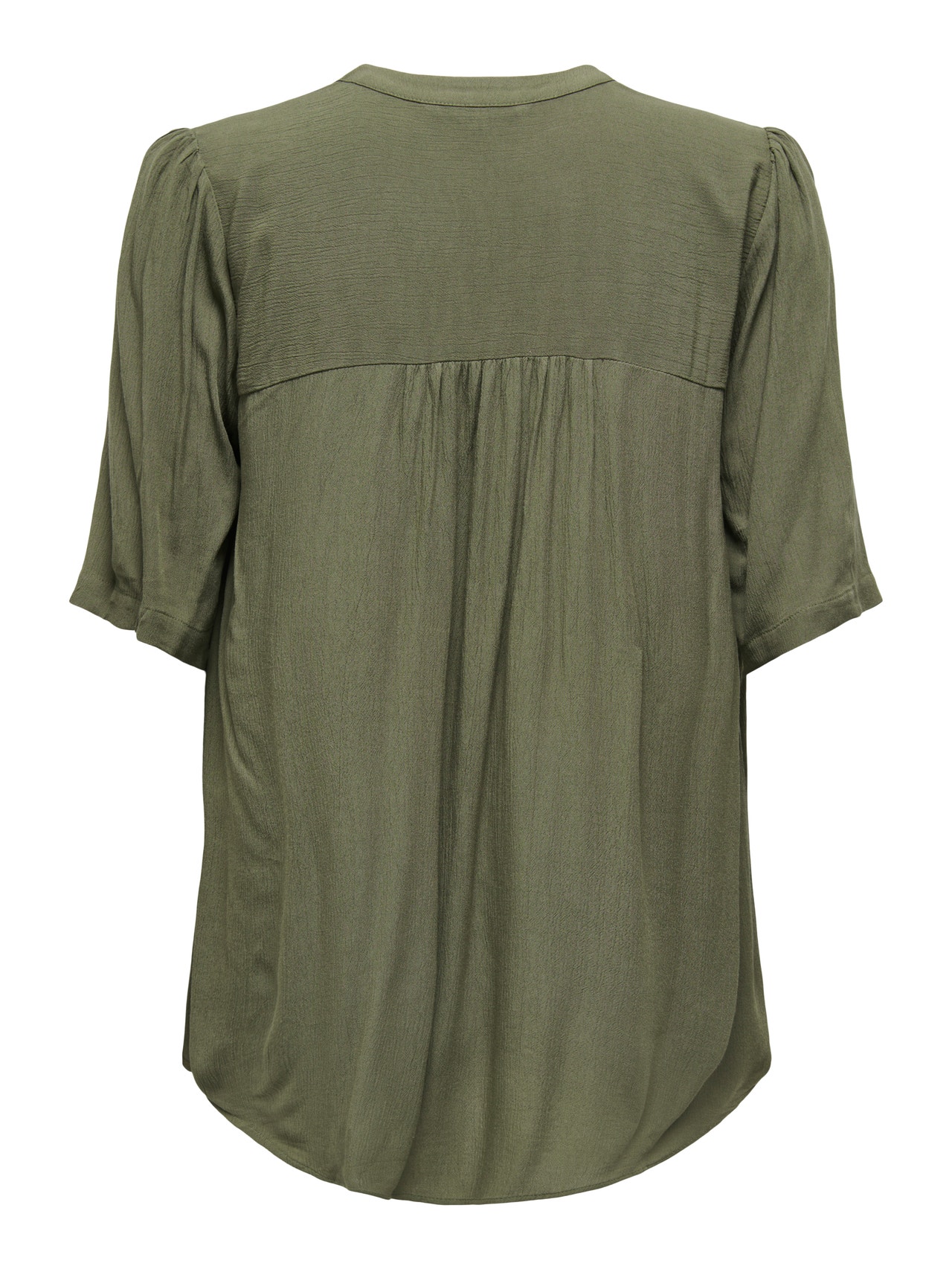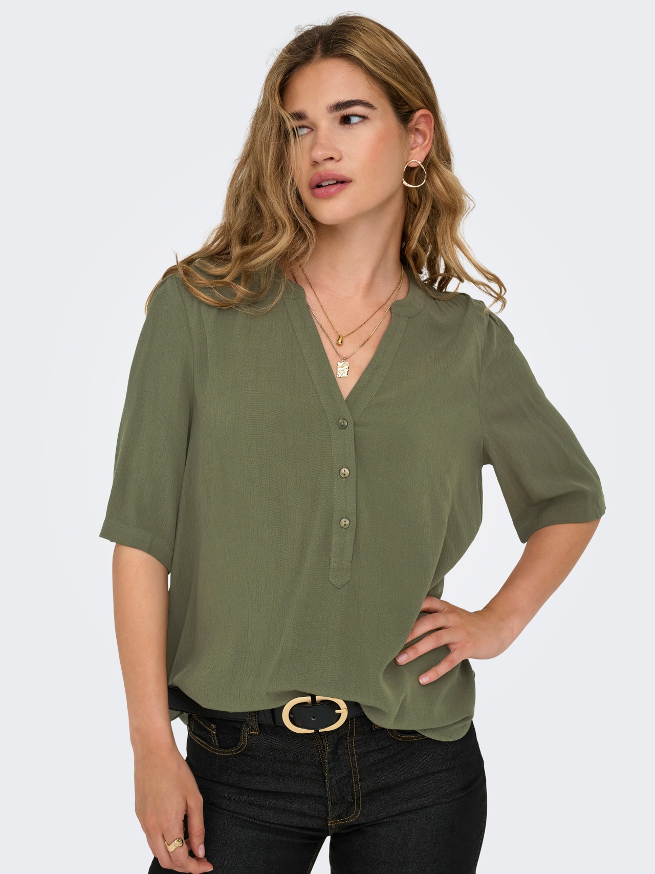 Forvandle hverdagsantrekket ditt på sekunder ved å legge til en feminin topp for en myk og ren look. Semsket skinn er en myk og lett skinntype med matt overflate og myk tekstur. - Produkttype : Topp - Hals : V-hals - Erme : 2/4 ermer - Ermer : Volumermer - Lukking : Knappelukking - Passform : Regular Fit