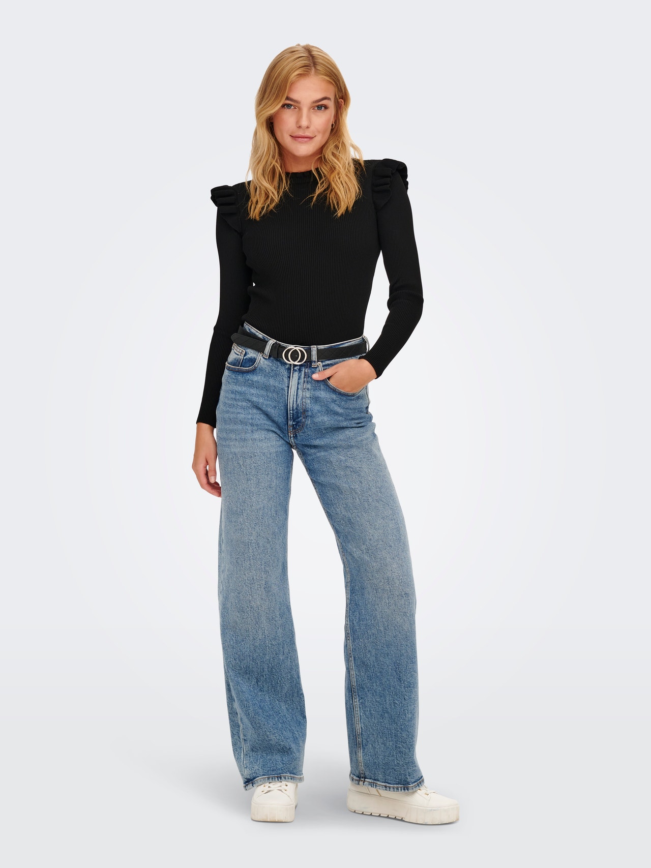 Maak je look helemaal af met een tijdloze gebreide trui voor extra zachtheid en warmte. - Producttype : Gebreide pullover - Hals : O-hals - Mouw : Lange mouwen - Details : Ruche detail - Pasvorm : Regular fit