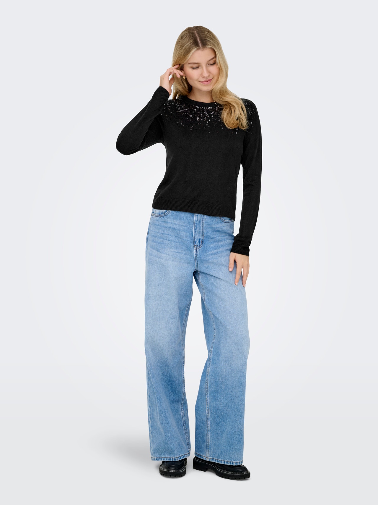 Utrzymuj ciepło i wygodę dzięki miękkim dzianinowym ubraniom, idealnym na każdą okazję i porę roku. - Rodzaj produktu : Sweter wkładany przez głowę - Szyja : Okrągły dekolt - Rękaw : Długie rękawy - Szczegóły : Element z cekinami - Krój : Krój regularny
