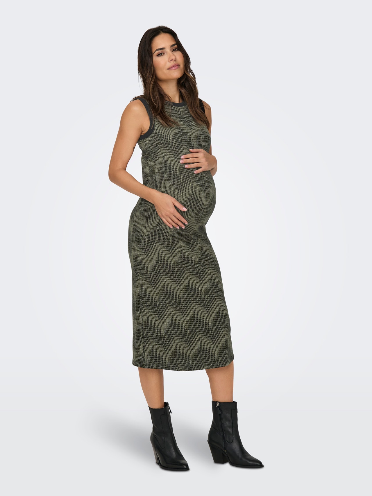 Os estilos de maternidade são concebidos para caber e suportar a gravidez. Escolha o seu tamanho normal para um aspeto lisonjeiro.