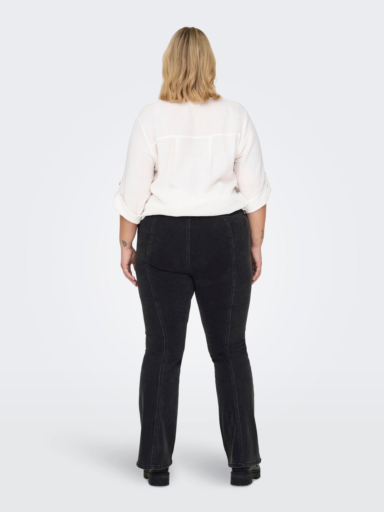 - Ajuste : Jeans curvy flared fit que se ajustam às ancas e coxas e se alargam do joelho para baixo.