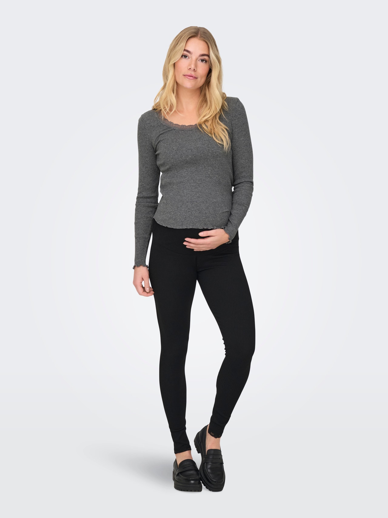 Os estilos de maternidade são concebidos para caber e suportar a gravidez. Escolha o seu tamanho normal para um aspeto lisonjeiro.
