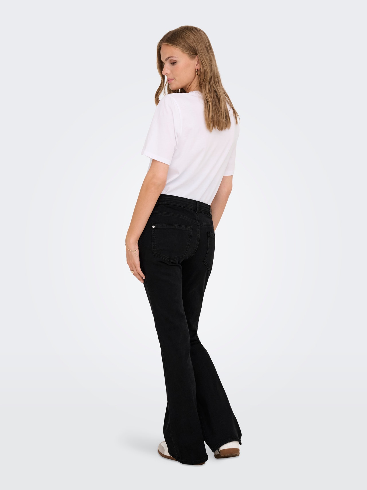 - Ajuste : Estas jeans flared fit abraçam as ancas e coxas e alargam do joelho para baixo