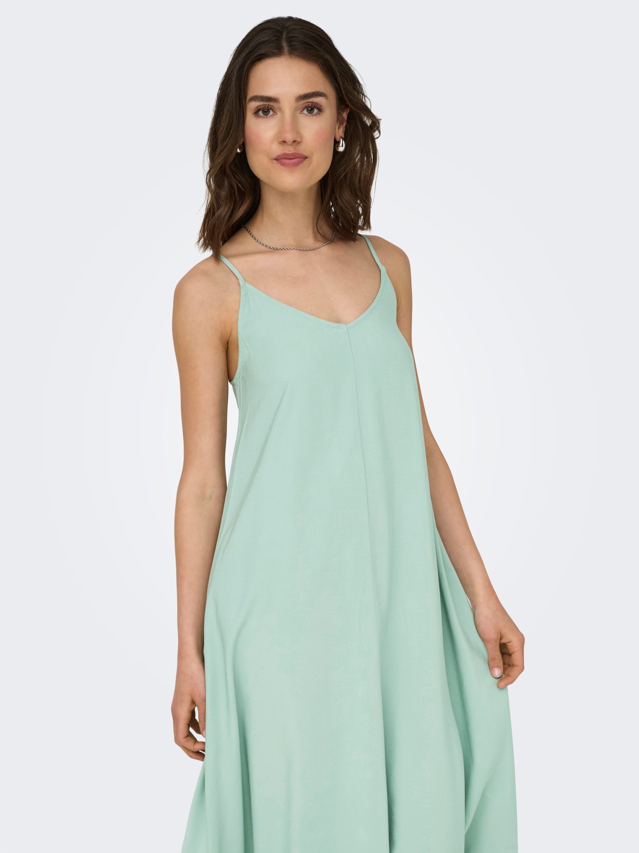 Nadgradite svojo garderobo z elegantno obleko in ustvarite osupljiv videz, ki ustreza vsaki priložnosti in letnemu času. - Vrsta izdelka : Obleka - Vrat : V-izrez - Rokav : Brezrokavnik (B/R) - Trakovi : Tanke naramnice - Zaključevanje : Zapenjanje na gumb - Prileganje : Ohlapno prileganje