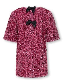 En vacker och funktionell klänning från ONLY MINI! Från färgglada vardagsklänningar till eleganta stilar som är både snygga och bekväma. Perfekt för både lek och speciella tillfällen. Kombinera med leggings och sneakers för en sportig look som är bekväm hela dagen. Velour kännetecknas av sin mjuka yta och subtila glans, vilket skapar komfort och en stilren look. ONLY MINI är ett modemärke för de minsta trendsättarna. Utforska en värld av mjuka tyger, snygg denim, söt design och romantiska detaljer som ger tjejer både komfort och stil varje dag. - Produkttyp : Stickad klänning - Nacken : O-ringning - Ärm : Långa ärmar - Ärmar : Nedsänkta axlar - Stängning : Tryckknappsstängning - Längd/storlek : Kort - Detaljer : Rosettdetalj, Paljettdetaljer - Passform : Normal passform - Observera : VARNING! Håll borta från eld.
