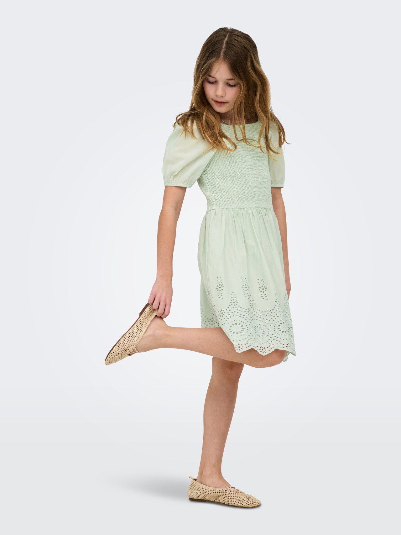Vår modell är 142 cm lång och bär storlek 140